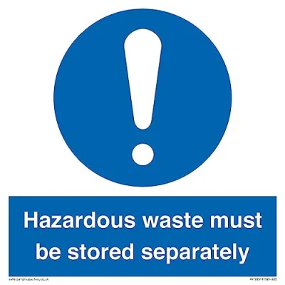M001 : General mandatory action This sign is made from vinyl high tack A stickier sticker. Uses a stronger adhesive to make it more suitable for plastic surfaces like Wheelie Bins or where the sticker might get rubbed. S20 square Sign Text: Hazardous waste must be stored separately