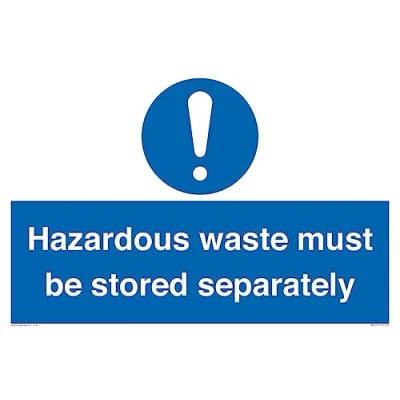 M001 : General mandatory action This sign is made from vinyl high tack A stickier sticker. Uses a stronger adhesive to make it more suitable for plastic surfaces like Wheelie Bins or where the sticker might get rubbed. A2 landscape Sign Text: Hazardous waste must be stored separately