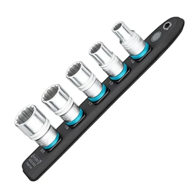 Practical: the magnetic underside of the socket spanner set ensures grip on all ferrous surfaces, e.g. on workshop trolleys, tool walls, machines, lifting platforms and in metal drawers High quality: the short rail with robust metal eyelet impresses with its durable and strong twist lock, thus ensures a secure fit, instant access and is easy to clean Easy: the 5 individual socket wrenches are securely fixed in the locked state: for removal, the socket wrench insert must be simply turned to the left Quality: Hazet is one of the leading manufacturers of quality tools for professional use and has more than 150 years of experience in development and production Box contents: 1x Hazet 900Z-SR/5 Smart-Rail, set of flexible plastic connector strip with 1⁄2 inch square sockets and 5 slots, magnetic and easy to clean. Dimensions: 245 x 37.4 mm