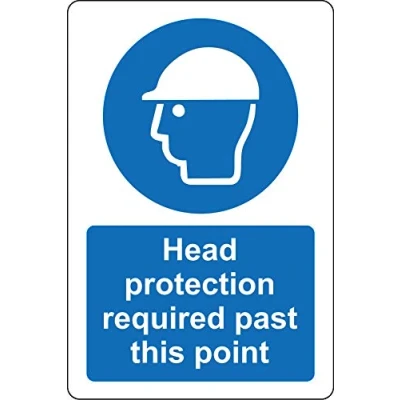 Head protection required past this point construction Safety sign 1.2mm Rigid plastic 200mm x 150mm Digitally printed for extra durability Drill and screw in position or use double sided tape to mount onto suitable surface., Manufacturer: KPCM Display ltd