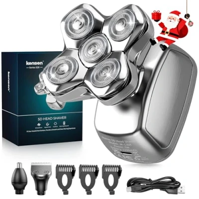 πππ₯π¨π¬π ππ¨ ππ€π’π§, ππππ¨π«ππ₯ππ¬π¬ ππ‘ππ―π’π§π πThe 2025 Upgraded 5D floating bald shaver perfectly adapts to your facial and scalp hair, providing a smooth 360Β° shave. The skin-protection design ensures a safe, close shave without cuts, making it ideal for those who want to achieve a bald look or cleanly shave their beard. πππ₯ππ«π ππ¨π§π ππ’ππ ππππππ«π² π°π’ππ‘ π ππ¬π ππ‘ππ«π π’π§π πPowered by a high-capacity 1200mAh lithium battery, this electric shaver delivers up to 120 minutes of use with just 2 hours of fast charging. A quick 1-minute daily shave means up to 4 months of use without frequent recharging, perfect for travel and on-the-go grooming. ππππ¬π² ππ¨ ππ¬π ππ§π ππ₯πππ§πEasy to hold, you can choose to grip the metal body above or wedge your fingers between the body and the blade. The magnetic head covers a larger shaving area, and the blades are easily removable for quick cleaning. The hassle-free design saves time, eliminating the need to disassemble blades repeatedly. ππππ% πππππ«π©π«π¨π¨π ππ’π§π ππππ«π ππ«π¨π¨π¦π’π§π ππ’ππThis balding clippers kit includes a hair shaver head, nose hair trimmer, hair clipper with 3 guide combs (3/5/7mm), and a Type-C charging cable for all body hair trimming needs. 100% waterproof for use in the shower, though itβs best to avoid prolonged soaking. ππππ’π₯π¨π«ππ ππ¨π« ππ’ππππ«ππ§π πππ’π« ππ²π©ππ¬πFor men with long or curly hair/beard, use the T-shaped trimmer head first to cut hair short, followed by the rotary shaver for the best results. This combination ensures a smooth, efficient shave regardless of hair type. ππππ―ππ§πππ ππ¬ π¨π ππ ππ₯ππππ¬π 5D blades have more durable batteries and consume less power than other 6D/7D blade head shavers. And 5D blades are easier to clean, 6D/7D blades tend to snag hairs more easily and make you replace them again with new blades, while 5D blades are more durable and environmentally friendly.