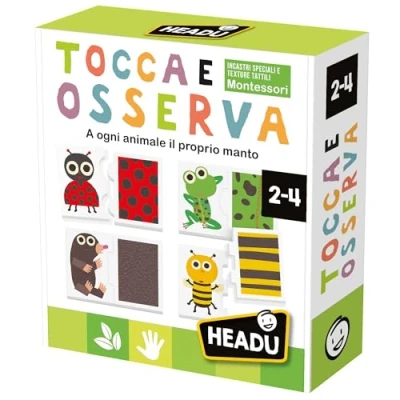 Tap and discover animals DEVELOPED SKILLS: Recognizing animals; Develop visual perception; Training tactile sensitivity CONTENT: 9 double-sided puzzles OTHER PLUS: High thickness cardboard ORIGIN: Made in Italy, Manufacturer: Headu srl
