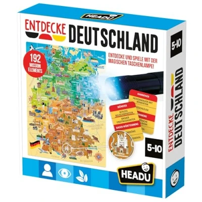 How it works: discover the geography of Germany in a playful way! Search cities on the map and explore famous landmarks, cultural highlights, typical animals, plants and many more exciting details around the Federal Republic with the magic torch. An interactive learning adventure full of surprises! Promoting skills: the game playfully conveys knowledge about Germany and its most important cities, lets children discover landmarks and famous places, recognise flora and fauna as well as compare different cultures. At the same time, they learn to understand and adhere to rules. Contents: the game contains a puzzle (47 x 37 cm) with 63 pieces, 16 double-sided task cards, a magic torch (3 AAA batteries are required for operation, not included), an hourglass and instructions. Age: The educational game is ideal for promoting the key competences of children aged 5 to 10 years. Perfect gift for any occasion: birthday parties, Christmas, Easter... will make children, teenagers, adults and the whole family smile., Manufacturer: Headu