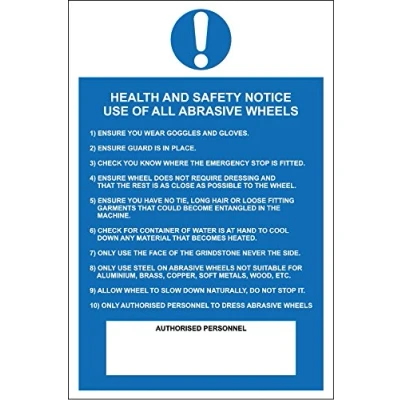 Health and safety notice use of all abrasive wheels safety sign 1.2mm rigid plastic 300mm x 200mm Digitally printed and laminated for extra durability Drill and screw in position or use double sided tape to mount onto suitable surface.