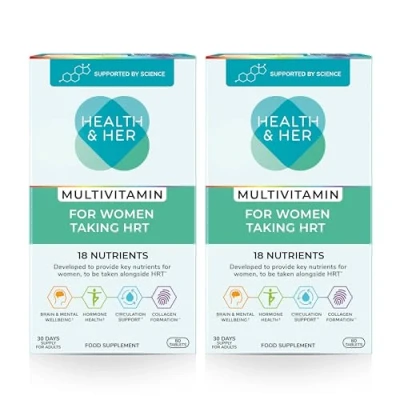 MULTIVITAMIN specifically designed for women taking hormone replacement therapy (HRT) Provides vitamins B6, B12 and C, Folic Acid, Magnesium, Selenium and Zinc – specially designed for women taking hormone replacement therapy (HRT). PLUS a spectrum of vitamins and minerals carefully blended to support daily wellbeing. VEGAN AND GLUTEN FREE with no added preservatives or artificial colours Download our FREE Health & Her Perimenopause & Menopause App to track, learn and build positive lifestyle habits