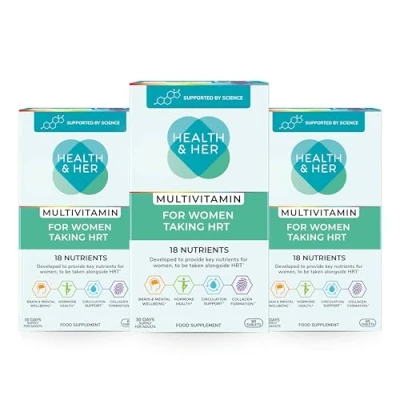 MULTIVITAMIN specifically designed for women taking hormone replacement therapy (HRT) Provides vitamins B6, B12 and C, Folic Acid, Magnesium, Selenium and Zinc – specially designed for women taking hormone replacement therapy (HRT). PLUS a spectrum of vitamins and minerals carefully blended to support daily wellbeing. VEGAN AND GLUTEN FREE with no added preservatives or artificial colours Download our FREE Health & Her Perimenopause & Menopause App to track, learn and build positive lifestyle habits