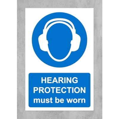 Hearing protection must be worn safety sign. Self adhesive sticker. Printed using the latest digital technology and laminated for extra durability. Remove backing film and apply to dry, smooth, oil free surface. All signs come with a 5-year warranty. All our signs are UV resistant meaning they will not fade in sunlight. Our vinyl stickers are temperature resistant from -40°C to +80°C.
