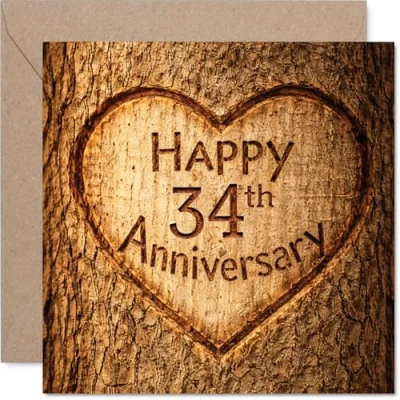 Heartfelt 34th Anniversary Card Rustic Charm for a Special Milestone Carved Heart on Wood Design Perfect Way to Mark 34 Years of Love 145mm Square, Envelope Included