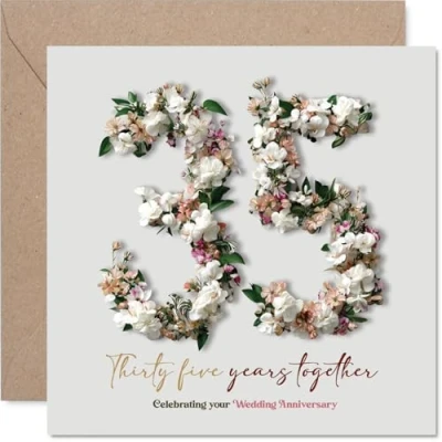 Mark a truly special milestone with this heartfelt card, featuring a beautiful floral arrangement forming the number 35-perfect for celebrating lasting love Combines classic white with pink and green blooms. giving the design a fresh. graceful feel that suits couples who appreciate understated elegance Printed on quality gloss single sided board with an uncoated inside-no smudging when writing inside. Made using FSC-certified materials and fully recyclable Blank inside, so you can add your own personal message. Includes a matching envelope for easy gifting. The 145mm Square format is convenient to display or post Created and printed in the UK with care, this card helps you share your warmest wishes with confidence for a memorable anniversary moment. Ideal for a mum or dad celebrating a milestone anniversary