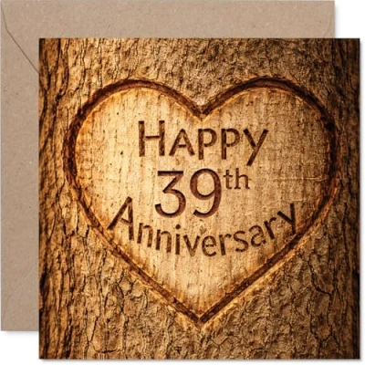 Warm and thoughtful, this card's carved heart detail on a rustic wood backdrop instantly sets a heartfelt, meaningful tone for the special day Features a striking wood-effect background and heart motif, giving a charming, handcrafted look that stands out from ordinary anniversary cards Crafted in the UK using recyclable materials and FSC-certified board, with a gloss finish outside and uncoated inside for easy writing. No smudging when writing inside Blank inside, so you can pen your own personal message. Comes complete with an envelope for easy gifting. The 145mm Square format is convenient to display or post Feel confident gifting a card that combines lasting quality with a unique design-ideal for marking 39 wonderful years together. Ideal for a mum or dad celebrating a milestone anniversary