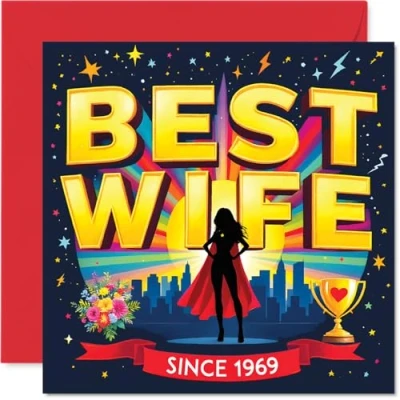 Bursting with affection. this vibrant card features standout 'Best Wife Since 1969' text and playful trophy and floral details. making any milestone feel extra special Retro superhero vibes meet charming blooms and a shining trophy. all set against an eye-catching mix of blue. yellow, and pink for a celebratory feel Printed on high-quality gloss single sided board with an uncoated inside - no smudging when writing inside. Made with FSC board and fully recyclable materials Blank inside, so you can share your own heartfelt words or a cheeky message. Comes complete with a matching envelope for that finishing touch Lovingly designed and printed in the UK, this card suits a wife, mum, or friend who deserves a hero's celebration. We aim for genuine smiles, every time