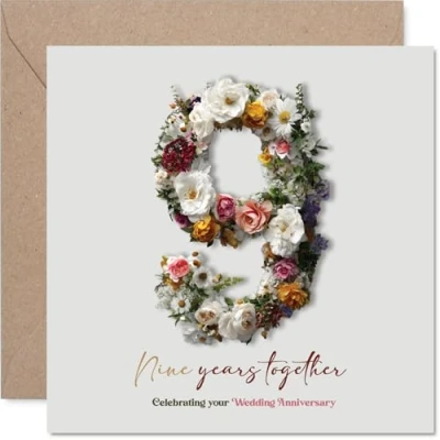 Celebrate nine years together with a heartwarming card featuring a beautiful floral number 9 - perfect for marking this special milestone. Anniversary card with a light-hearted design style Features a vibrant arrangement of pink, yellow, and green flowers artfully shaped into the number nine for a fresh and cheerful look. Recyclable and printed in UK for a considerate choice Printed on quality gloss single sided board with uncoated inside - No smudging when writing inside, so your message stays neat. Printed on 360 micron stock for a confident, premium feel Blank inside, giving you plenty of space to add your own personal anniversary wishes. Supplied with a matching envelope for convenience. The 145mm Square format is convenient to display or post Proudly made in the UK using recyclable, FSC-certified - a thoughtful choice that looks good and feels even better to give. Ideal for a mum or dad celebrating a milestone anniversary
