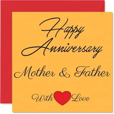 A heartfelt design that shares warm wishes, featuring a bold red heart and stylish script to mark a special anniversary. Anniversary card for Mother & Father with a light-hearted design style Elegant typography with a classic heart symbol brings a timeless feel, set against cheerful yellow and red for extra joy. Recyclable and printed in UK for a considerate choice Printed on quality gloss single sided board with an uncoated inside for a smooth writing experience. No smudging when writing inside. Printed on 360 micron stock for a confident, premium feel Blank inside, giving you the perfect space to add your own personal message. Comes with an envelope for easy gifting. The 145mm Square format is convenient to display or post Designed and printed in the UK with recyclable materials and FSC-certified for a thoughtful, sustainable touch. A thoughtful choice that helps you send smiles and warm wishes