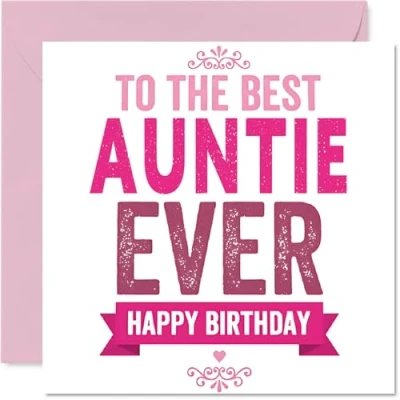 Brings a big smile with its cheerful 'TO THE BEST AUNTIE EVER' message in lively pink and white, making her feel truly cherished. Birthday card for Auntie with a light-hearted design style Features a vibrant, playful motif that celebrates family bonds and shows your auntie how much she's adored. Recyclable; printed in UK for a considerate choice Crafted on high-quality gloss single sided board with an uncoated inside, so no smudging when writing inside your personal message. Printed on 360 micron stock for a confident, premium feel Blank inside for your own thoughtful words and comes complete with a matching envelope to make gifting easy. The 145mm Square format is convenient to display or post Proudly printed in the UK on FSC-certified, recyclable card - designed to be as lovely for the planet as it is for her. A thoughtful choice that helps you send smiles and warm wishes