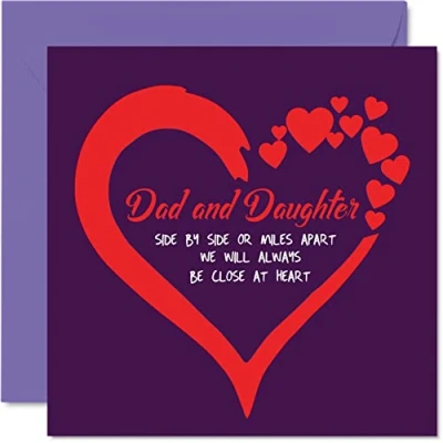 MAKE DAD SMILE WITH THIS HILARIOUS HAPPY BIRTHDAY CARD DAD: This exceptional quality fathers day card for him shows the design "Dad and Daughter Side By Side Or Miles Apart We Will Always Be Close At Heart". If you are looking for beautiful birthday greetings cards for him, then this happy fathers day card is bound to make them laugh. Not just for fathers day gifts for Dad this could also be a birthday card for Dad, Daddy, Papa or Father. 50th birthday gifts men WHAT DO YOU GET: The card is printed on one side and BLANK ON THE INSIDE to allow you to write your very own message. The unique fun design is printed on a specially sourced and environmentally responsible board. At 360 microns thick the natural white one-sided gloss board has a quality look and feel. Supplied with a coloured gummed envelope to complement the design and ready to be sealed and sent in the post. NO INK SMUDGES: There is nothing worse than writing inside a card to find that the shiny surface makes the ink smudge. This is why we use a high quality one sided coated board. The uncoated side will absorb more of the ink from your pen to make smudging a thing of the past. Happy birthday Dad cards, Dad birthday card, Daddy birthday cards. SIZES: Greeting Card = 145mm x 145mm, Envelope = 155mm x 155mm, Card Thickness = 360 micron. Great Dad fathers day cards from Daughter or Son. Dad birthday cards from Daughter, birthday cards for Dad, birthday card Daddy, Father birthday card, Dad birthday cards from Son, Dad cards birthday, special Dad birthday cards, Dad 50th birthday card, birthday card Dad from Daughter. MADE AND QUALITY CHECKED IN THE UK: We print and manufacture all our product right her in the UK so you can be sure of a fast turnaround and a product that is expertly made. Using environmentally responsible premium board our card is conscious of the responsible management of the world's forests - birthday cards Dad, birthday card Father, Step Dad birthday card, Dads birthday card.