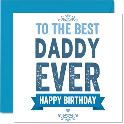 Packed with feel-good vibes, this card's bold 'TO THE BEST DADDY EVER' message brings a big smile and makes any birthday feel truly special. Birthday card for Daddy with a light-hearted design style Features a cheerful blue and white design with eye-catching lettering, adding a lively touch to dad's celebrations. Recyclable; printed in UK for a considerate choice Printed on glossy single sided board with an uncoated inside for effortless writing. No smudging when writing inside. Printed on 360 micron stock for a confident, premium feel Blank inside, leaving plenty of space for your personal heartfelt message. Includes envelope for easy gifting. The 145mm Square format is convenient to display or post Proudly designed and printed in the UK using FSC-certified, recyclable materials for a quality card you can trust. A thoughtful choice that helps you send smiles and warm wishes