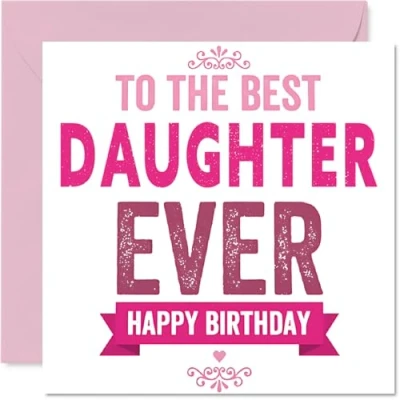 Delivers a big, heartfelt message with vibrant pink and white colours and bold 'To the Best Daughter Ever' lettering right on the front. Birthday card for Daughter with a light-hearted design style Features a lively celebratory design, perfect for making your daughter feel extra loved and appreciated on her special day. Recyclable; printed in UK for a considerate choice Printed on quality gloss single-sided board with an uncoated inside for a premium feel. No smudging when writing inside. Printed on 360 micron stock for a confident, premium feel Blank inside so you can pen your own personal birthday wishes. Includes a matching envelope for easy gifting. The 145mm Square format is convenient to display or post Designed and printed in the UK using recyclable FSC-certified, offering a thoughtful touch you can feel good about. A thoughtful choice that helps you send smiles and warm wishes