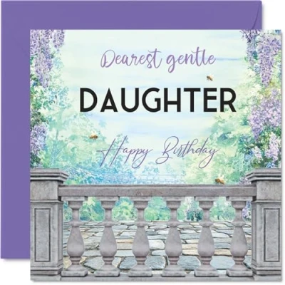 Conveys warmth and love with its gentle floral artwork and tranquil stone railing, making her feel truly cherished on her birthday. Birthday card for Daughter with a light-hearted design style Features a serene nature-inspired motif with elegant purple, green and blue flowers for a timeless, soothing look. Recyclable and printed in UK for a considerate choice Crafted on gloss single sided board with an uncoated inside-no smudging when writing inside, so your personal message stays neat. Printed on 360 micron stock for a confident, premium feel Blank inside, letting you express your own heartfelt wishes. Comes complete with a quality envelope for easy gifting. The 145mm Square format is convenient to display or post Printed in the UK using recyclable FSC, this card promises thoughtful quality and a touch of eco-friendly care. A thoughtful choice that helps you send smiles and warm wishes