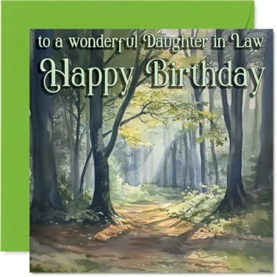 Conveys a heartfelt birthday message with a tranquil forest bathed in gentle sunlight, creating a sense of warmth and appreciation. Birthday card for Daughter in Law with a light-hearted design style Features a beautifully illustrated woodland landscape in soothing greens and browns, bringing the calming beauty of nature to their day. Recyclable; printed in UK for a considerate choice Printed on quality gloss single sided board, with an uncoated inside for easy writing. No smudging when writing inside. Printed on 360 micron stock for a confident, premium feel Blank inside - plenty of space for your personal message, plus comes with an envelope ready for gifting. The 145mm Square format is convenient to display or post Made in the UK using FSC-certified and fully recyclable materials, so you can send your wishes with peace of mind. Printed in the UK. A thoughtful choice that helps you send smiles and warm wishes