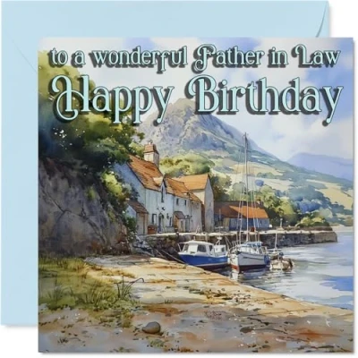Captures a peaceful moment with boats resting by the water, making it a warm and thoughtful way to send birthday wishes. Birthday card for Father in Law with a light-hearted design style Charming hand-painted style landscape scene creates a timeless motif, bringing a sense of calm and appreciation to the occasion. Recyclable and printed in UK for a considerate choice Printed on quality gloss single sided board with an uncoated inside for easy writing. No smudging when writing inside. Printed on 360 micron stock for a confident, premium feel Blank inside, giving you plenty of space to add your own personal birthday message. Comes complete with a crisp envelope. The 145mm Square format is convenient to display or post Proudly designed and printed in the UK using FSC-certified and fully recyclable materials-thoughtful for both people and planet. A thoughtful choice that helps you send smiles and warm wishes