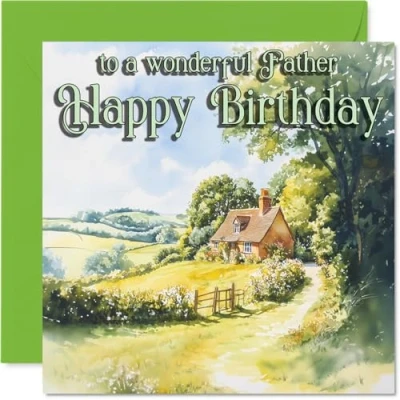 Captures a heartfelt birthday mood with its peaceful house nestled in lush greenery, making any dad feel truly appreciated. Birthday card for Father with a light-hearted design style Features a beautifully painted countryside scene in green and yellow, setting a comforting and inviting tone. Recyclable; printed in UK for a considerate choice Printed on quality gloss single sided board with an uncoated inside, so no smudging when writing inside your personal message. Printed on 360 micron stock for a confident, premium feel Blank inside, giving you space to write your own birthday wishes; comes complete with a matching envelope. The 145mm Square format is convenient to display or post Proudly made in the UK using FSC-certified, recyclable -crafted with care for both your family and the environment. Printed in the UK. A thoughtful choice that helps you send smiles and warm wishes