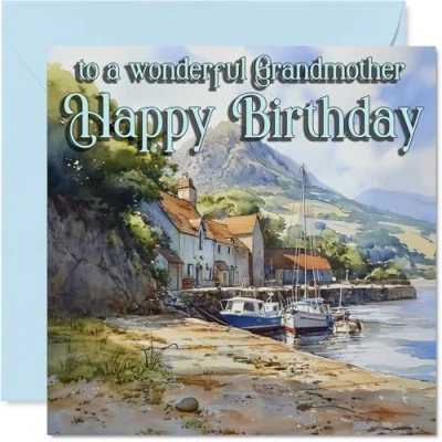 Heartfelt Birthday Card for Grandmother Warm Wishes by the Seaside Peaceful Landscape with Boats and Cottages 145mm Square, Envelope Included