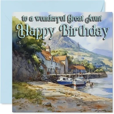 Heartfelt Birthday Card for Great Aunt Serene Coastal Charm Tranquil Seaside Boats and Cottages Scene a Warm Touch Special 145mm Square, Envelope Included