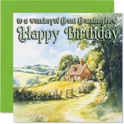 Brings a heartfelt touch with its tranquil countryside illustration, complete with a cosy house that radiates warmth and affection. Birthday card for Great Grandnephew with a light-hearted design style Features a beautifully painted rural landscape in soothing green, yellow, and brown tones for a classic, timeless feel. Recyclable; printed in UK for a considerate choice Crafted on gloss single sided board with an uncoated inside for easy writing. No smudging when writing inside. Printed on 360 micron stock for a confident, premium feel Blank inside - ready for your own thoughtful message. Includes a coordinating envelope for effortless gifting. The 145mm Square format is convenient to display or post Proudly designed and printed in the UK using FSC-certified, recyclable materials, so you can send it with confidence. A thoughtful choice that helps you send smiles and warm wishes