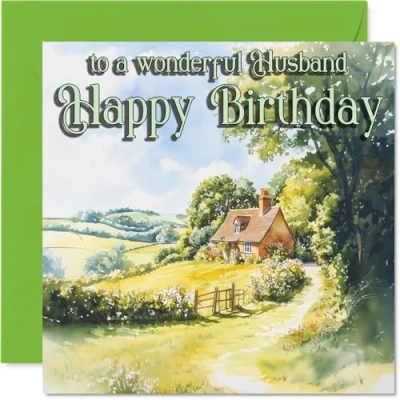 Brings a heartfelt smile with its tranquil countryside and charming house, creating a sense of warmth and love for his special day. Birthday card for Husband with a light-hearted design style Features a beautifully illustrated rural setting in soft green, yellow, and brown tones for a peaceful, homely vibe. Recyclable; printed in UK for a considerate choice Printed on quality gloss board with an uncoated inside; no smudging when writing inside, so your message will look just right. Printed on 360 micron stock for a confident, premium feel Blank inside to let your own words take centre stage, and comes complete with a matching envelope for easy gifting. The 145mm Square format is convenient to display or post Crafted in the UK using FSC-certified and recyclable materials, so you can feel good about your thoughtful choice. Printed in the UK. A thoughtful choice that helps you send smiles and warm wishes