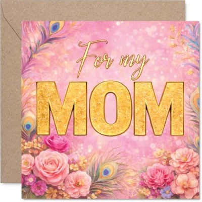 Heartfelt Birthday Card for Mom Bursting with Love Pink and Gold Flowers Peacock Motif Striking Design a Special Mum, Mother's Day 145mm Square, Envelope Included
