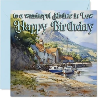 Heartfelt Birthday Card for Mother in Law Warm Wishes by the Coast Serene Landscape with Boats and Charming Houses 145mm Square, Envelope Included