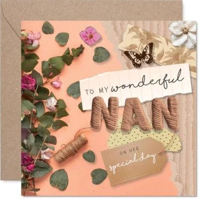 Thoughtfully crafted to make your nan feel truly cherished, featuring a heartfelt message surrounded by charming butterflies and soft florals Lovely butterfly motif set among pastel flowers brings a gentle. uplifting touch. perfectly capturing the warmth and love for a special occasion Printed on quality gloss board with an uncoated inside for easy writing. No smudging when writing inside, so your message stays crisp and clear Blank inside for your own personal words. Comes complete with a coordinating envelope, ready to send or give in person. The 145mm Square format is convenient to display or post Designed and printed in the UK using FSC-certified, recyclable - a card you can feel good about giving. A thoughtful choice that helps you send smiles and warm wishes