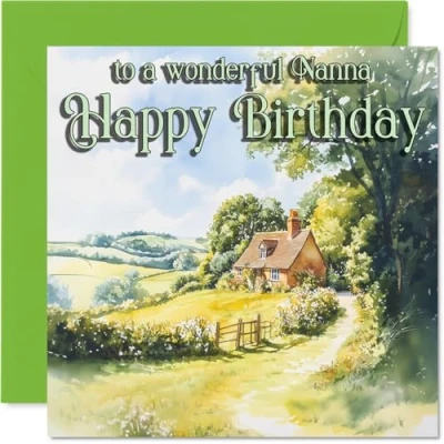 Captures a truly heartwarming vibe with its peaceful countryside cottage, offering a gentle and affectionate birthday wish. Birthday card for Nanna with a light-hearted design style Features a soft green and pastel palette, with a delightful nature motif that feels both timeless and calming. Recyclable; printed in UK for a considerate choice Crafted from gloss single sided board with an uncoated inside - no smudging when writing inside, for a thoughtful finish. Printed on 360 micron stock for a confident, premium feel Blank inside, so you can add your own personal touch; comes complete with a matching envelope for easy gifting. The 145mm Square format is convenient to display or post Made in the UK using FSC certified, fully recyclable - designed to leave a lasting impression without costing the earth. Printed in the UK. A thoughtful choice that helps you send smiles and warm wishes