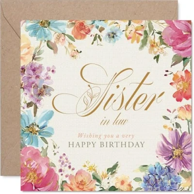 Brimming with heartfelt warmth, this card features a colourful arrangement of flowers framing a sincere birthday message for your sister in law The charming pastel floral motif stands out with its vibrant brushstrokes, offering a look that's both classic and uplifting for her big day Crafted on quality gloss single sided board and uncoated inside for a smooth writing experience. No smudging when writing inside. Printed on 360 micron stock for a confident, premium feel Blank inside, so you can add your own personal message. Comes complete with a matching envelope for a polished finish. The 145mm Square format is convenient to display or post Designed and printed in the UK using FSC-certified and fully recyclable materials, so you can share joy responsibly. A thoughtful choice that helps you send smiles and warm wishes
