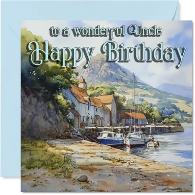 Heartfelt Birthday Card for Uncle Serene Coastal Vibes Boats and Houses in A Tranquil Seaside Scene Warm Touch Your Wonderful 145mm Square, Envelope Included