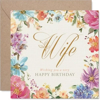 A heartfelt card with a beautiful floral border that sets a loving, thoughtful tone for her big day. Birthday card for Wife with a light-hearted design style Features elegant pastel flowers and stylish typography, perfect for making your wife feel cherished. Recyclable; printed in UK for a considerate choice Crafted from gloss single sided board with an uncoated inside - no smudging when writing inside. Printed on 360 micron stock for a confident, premium feel Blank inside, giving you plenty of space for your own personal birthday message. Includes envelope. The 145mm Square format is convenient to display or post Printed in the UK using FSC-certified and fully recyclable materials for peace of mind. A thoughtful choice that helps you send smiles and warm wishes
