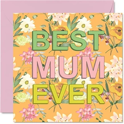MAKE MUM SMILE WITH THIS SWEET MOTHERS DAY CARD: This exceptional quality mothers day card for her shows a classy, colourful floral design saying "Best Mum Ever". If you are looking for beautiful greetings cards for her, then this happy mothers day card is bound to make them smile. Not just for mothers day for Mum this could also be for birthdays for Mother, Mummy, Mom, Mama, Mama, or Mommy. WHAT DO YOU GET: The card is printed on one side and BLANK ON THE INSIDE to allow you to write your very own message. The unique stylish design is printed on a specially sourced and environmentally responsible board. At 360 microns thick the natural white one-sided gloss board has a quality look and feel. Supplied with a coloured gummed envelope to complement the design and ready to be sealed and sent in the post. NO INK SMUDGES: There is nothing worse than writing inside a card to find that the shiny surface makes the ink smudge. This is why we use a high quality one sided coated board. The uncoated side will absorb more of the ink from your pen to make smudging a thing of the past. Happy mothers day Mum cards, Mam birthday card, Mom birthday cards. SIZES: Greeting Card = 145mm x 145mm, Envelope = 155mm x 155mm, Card Thickness = 360 micron. Great mum mothers day cards from Daughter or Son. Mum birthday cards from Daughter, cards for Mum, card Mum, Mother day card, Mum day cards from Son, Mum cards birthday, special Mum birthday cards, mothers card Mum from Daughter. MADE AND QUALITY CHECKED IN THE UK: We print and manufacture all our product right her in the UK so you can be sure of a fast turnaround and a product that is expertly made. Using the very best Forest Stewardship Council certified board our card is conscious of the responsible management of the world's forests - birthday cards Mum, birthday card Mother, Step Mum birthday card, Mums birthday card.