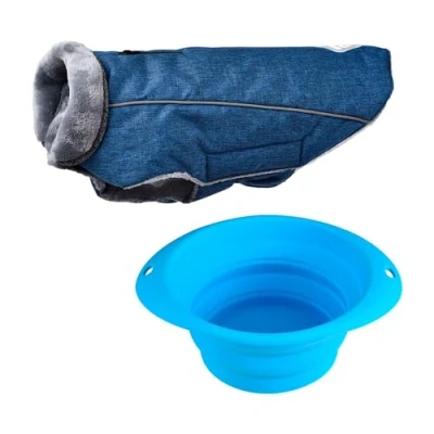 Hearts&Homies 40cm Blue Coat Set + Round Foldable Pet Bowl Thermal Pet Coat Size L 40 cm It can protect pets during outdoor activities, and it is easy to put on and take off. Machine washable. Colour: blue Round collapsible bowl made of silicone. Safe material, portable and convenient, with a large capacity.