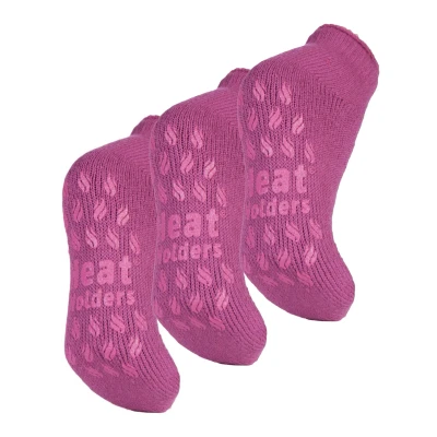 The same warmth and comfort as the original Heat Holders® slipper sock, but in a shorter low cut length! Keep feet warm on the coldest of days and pull on this pair of slipper style, ankle length Heat Holders® for ladies, the warmest thermal sock. Thick, chunky and with a massive tog rating of 2.34, Heat Holders® are made from a specially developed heavy bulk yarn which has extreme thermal qualities. With long pile cushioning, these thermal socks will help keep feet fully comfortable and supported. The inside of each sock has been intensively brushed that not only feels sensationally soft but also traps warm air close to the skin keeping your feet warmer for longer. They Include non-slip grippers on the bottom to provide better traction on indoor wood or tiled surfaces. These socks come in 3 pairs per pack which makes them great value for money, there are also 6 different types of colours and styles available so you’ll have plenty of pairs and colours to keep you warm this winter. These are Ladies one size 4-8 UK and are available in 6 different colour variations: Deepest Plum, Violet, Pink & more. They are made from 91% Acrylic, 5% Polyamide, 3% Polyester, 1% Elastane and are Machine Washable.