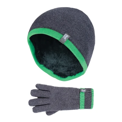HEAT HOLDERS Children Boys Winter Warm Fleece Lined Insulated Knit Turn Over Cuff Ribbed Hat and Gloves Set (7 10 Years, CG1P8)