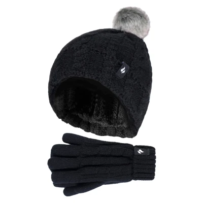 HEAT HOLDERS Girls Bobble Pom Hat and Gloves Set Turn Over Cuff & Cable Knit Style (7 10 Years, Black)