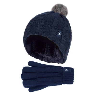 HEAT HOLDERS Girls Bobble Pom Hat and Gloves Set Turn Over Cuff & Cable Knit Style (7 10 Years, Navy)