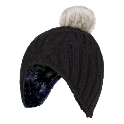 Complete your child's Winter ensemble with these faux fur pom pom bobble hat for girls. Keeping your child warm in Winter is always a must! And with these Heatweaver thermal brushing insulation which is like a plush fur-like thermal lining that maximizes the amount of warm air held close to the skin. Heat Holders specially developed thermal yarn provides high performance insulation against cold with superior moisture breathing abilities. The stretchable construction contours around the natural shape of your body for an improved fit, warmth and comfort. Not only does this hat keep your head and ears warm, but they also have a pull on beanie feature which makes it easy to slip on and off. The ear flaps sit comfortable at the side of your child's hat in order to retain heat and warmth close to the skin. Whether you're stocking up on your child's Winter collection, or shopping for school, this pull on beanie is ideal for casual wear and even, Winter holidays! This hat offers a generous amount of space for your child's heard making it perfect for a cosy feel. They are available in 3 colours of Black, Coud Grey, and Buttercream. They are available in ages 3-6 years.