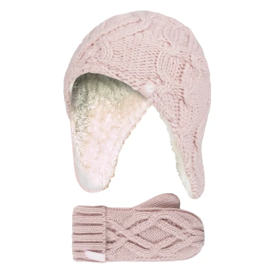 HEAT HOLDERS Girls Majestic Soft Cosy Cable Knitted Design Bobble Trapper Hat and Mittens Gloves Set (3 6 Years, Dusky Pink)