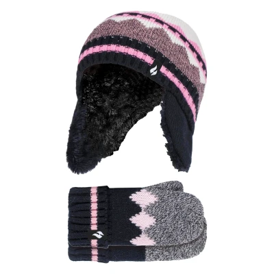 HEAT HOLDERS Girls Nordic Pattern Fairisle Design Trapper Hat with Mittens Gloves Set (3 6 Years, Black)