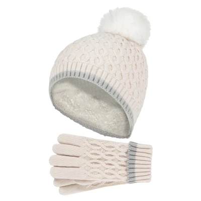 HEAT HOLDERS Girls Thermal Insulated Pom Bobble Beanie Hat and Gloves Colourful Pastel Styles (7 10 Years, Buttercream)