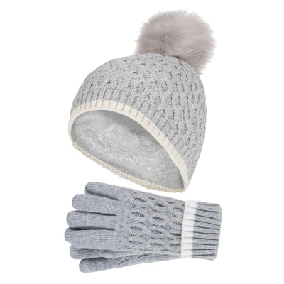 HEAT HOLDERS Girls Thermal Insulated Pom Bobble Beanie Hat and Gloves Colourful Pastel Styles (7 10 Years, Cloud Grey)