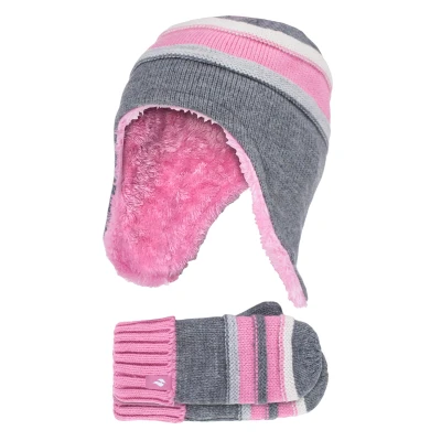 Heat Holders Girls Snowy Retreat Hats And Mittens Children love winter, but without the right hat and gloves, they can quickly get too cold to enjoy it! The Heat Holders range of children’s thermal hats, mittens and gloves will keep them warm whatever the weather. With hi-tech HeatWeaver® thermal lining to keep kids warm even in the very coldest conditions, this range of hats and mittens are warm, comfortable, and stylish! For active kids, there are stylish hats and gloves to keep your child's ears warm no matter how long they stay outside! This range of girls hats and mittens features Heatweaver insulation which is a plush fur-like lining that maximises the amount of warm air held close to the skin, keeping your kids heads, ears and hands warmer for longer! Heat Holders are recognised for their incredibly warm use of materials especially, their developed thermal yarn which provides high performance insulation against cold with superior moisture breathing abilities. Crafted with stretchable construction, these hats and mittens contours around the natural shape of your child's head and hands for a better, improved fit. If you're looking to keep your daughter warm with the perfect Winter essentials, these hats and mittens will do just the trick! Featuring striped colours and designs, these matching hats and gloves are lined with soft thermal inner brushed lining that maximises warmth and comfort. The mittens have a long turn over cuff enabling your child to adjust the length of the mitten around your wrist. The flappy ears fit loosely yet comfortably around the ears to retain heat and warmth close to the skin. Extra Product Details - Girls Hats and Mittens - Snowy Retreat Style - Heat Holders Yarn - Heat Holders Brushing - Heat Holders Insulation - Pom Pom Detail - Matching Hats and Glove - 3 Colours - 3-6 Years