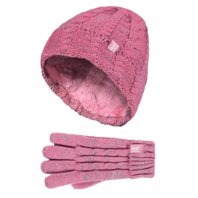 HEAT HOLDERS Kids Girls Cute Cable Knitted Warm Fleece Lined Winter Beanie Hat and Gloves Set (7 10 Years, CS4P14)