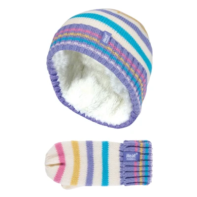 HEAT HOLDERS Kids Girls Fleece Lined Knitted Striped Colourful Winter Thermal Hat and Mittens Set (3 6 Years, CS2P11)